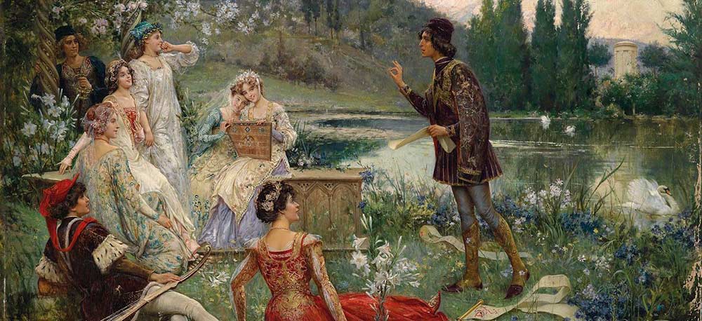 Escrito por Bocaccio entre 1351 y 1353 narra la historia de diez jóvenes que huyen de Florencia durante la peste que asoló la ciudad en 1348 y se refugian en una villa durante catorce días durante los cuales se entretienen contándose cuentos. Diez días (descansan viernes y sábado), diez cuentos cada uno, igual a 100 relatos. Los personajes de las historias son mundanos, procaces, y mentirosos, y sus aventuras graciosas y picantes. Las mujeres no dudan en dejarse arrastrar por la infidelidad por culpa de unos maridos poco apasionados y el clero es libertino y obseso (algo que se repite en todos los cuentos eróticos populares, no en vano Bocaccio se nutre de varias fuentes como los fabliaux o cuentos medievales)